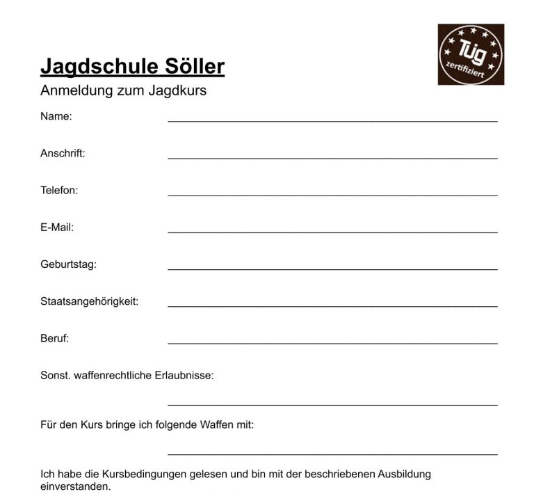 Falls Interesse an unserem Jagdkurs besteht, können Sie sich hier unser Anmeldeformular als .pdf und herunterladen und uns dieses per Mail (jaegerfischer@t-online.de) oder Post (Gerhard Fischer, Im Söller 2, 72336 Balingen-Frommern) zusenden.